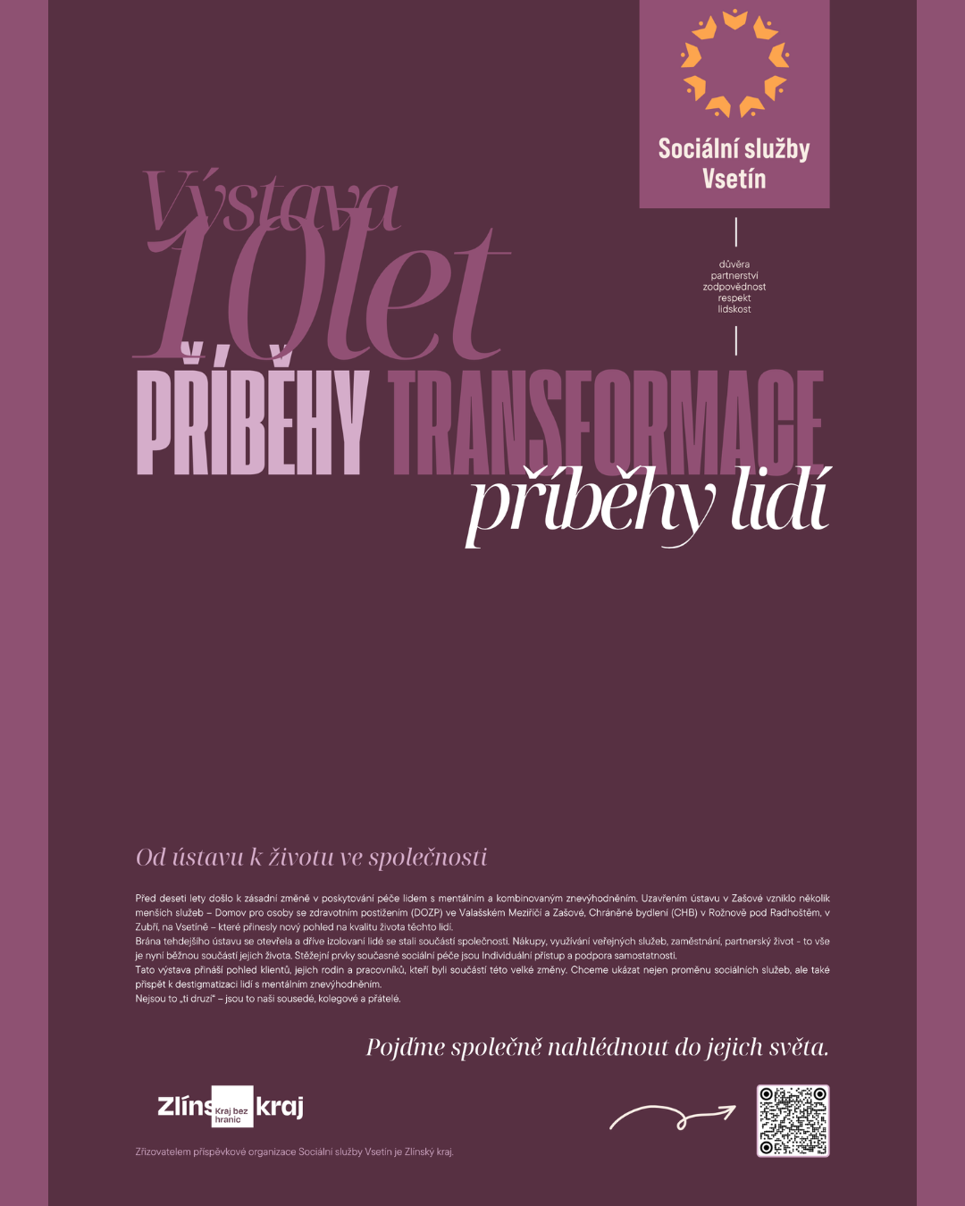 Před deseti lety došlo k významné změně v péči o lidi s mentálním a kombinovaným znevýhodněním, která znamenala přechod od velkokapacitního ústavu k menším, komunitním službám. Tato proměna přinesla klientům možnost žít běžný život – využívat veřejné služby, pracovat, navazovat vztahy a být plnohodnotnou součástí společnosti. Výstava „10 let od zrušení ústavu v Zašové" představuje příběhy klientů, jejich rodin a pracovníků, kteří tuto změnu zažili na vlastní kůži. Ukazuje, jak je důležitý individuální přístup a podpora samostatnosti, a pomáhá odbourávat mýty a předsudky o lidech s mentálním znevýhodněním.