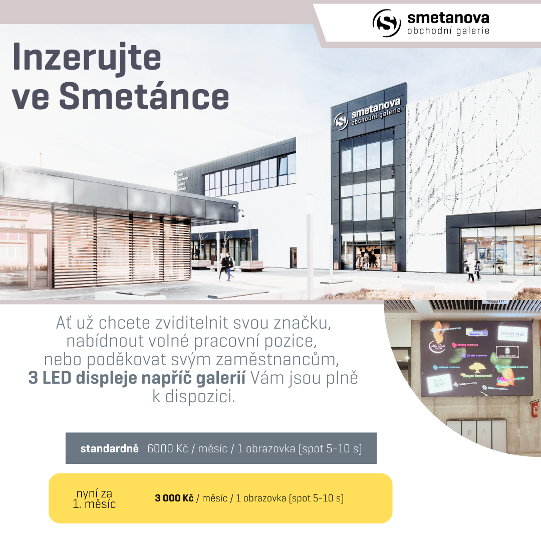 Hledáte účinný způsob, jak oslovit široké publikum? Naše obchodní centrum nabízí jedinečnou příležitost k inzerci na šesti moderních LED displejích, které jsou rozmístěny na strategických místech. V našem obchodním centru však naleznete více možností pro dokonalou reklamu, celou nabídku reklamních a nájemních prostor si můžete přečíst zde.